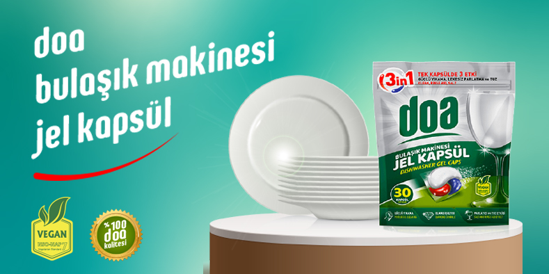 Doa “Bulaşık Makinesi Jel Kapsül” Tüketicisiyle Buluştu! Temizlik alanında onlarca farklı ürünle evlere hijyen sunan Doa ürün grubu ailesinin yepyeni üyesi Doa Bulaşık Makinesi Jel Kapsül oldu! Uzun zamandır Doa dostu tüketiciler tarafından merakla beklenen ve yoğun istek alan bulaşık makinesi tableti, kısa sürede makinelerin favorisi olmak için hazır. Tek kapsülde 3 etki birden sunan Doa Jel Kapsül; içeriği sayesinde güçlü yıkama, lekesiz parlatma ve tuz vadediyor. Türkiye’nin %100 yerli markası olan Doa’nın yeni ürünü Doa Jel Kapsül, parlatıcı ve tuz etkisiyle bulaşıklarınızda parlaklık sunarken; güçlü yıkama teknolojisi ve elmas ışıltısı sunan içeriğiyle zorlu lekelerde dahi Doa Temizlik kalitesini sunmaya devam ediyor. Her bir paketinde 30 Kapsül yer alan Doa Jel Kapsül sayesinde 30 yıkamada bütçesinin doa'sına bakacak olan kullanıcılarımız, aynı zamanda Doa'nın vegan içeriği sayesinde tüm bulaşıklarında doğallığın güvenini yaşayabilecek. Doa Bulaşık Makinesi ürün grubunda yeni Doa Bulaşık Makinesi Jel Kapsül'ün yanı sıra; Doa Bulaşık Makinesi Temizleyici, Doa Bulaşık Makinesi Parlatıcı, Doa Bulaşık Makinesi Tuzu ve Doa Sprey Bulaşık yer alıyor.